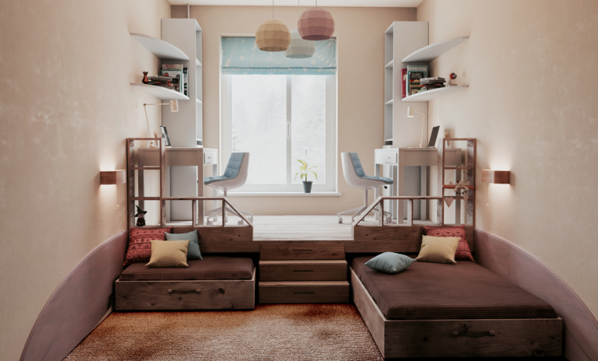 Если же подростки будут против совместной двухъярусной кровати, можно поставить две отдельные, под каждой из них сделав подиумы для хранения вещей и бытовых предметов. Еще вариант – организовать один большой подиум, на котором разместить рабочую зону (письменные столы и шкафчики для книг), а под ним сделать выдвижные ящики. Таким образом, освободится полезная площадь, которую можно использовать для других целей (игр, спортивных занятий и т. п.).
