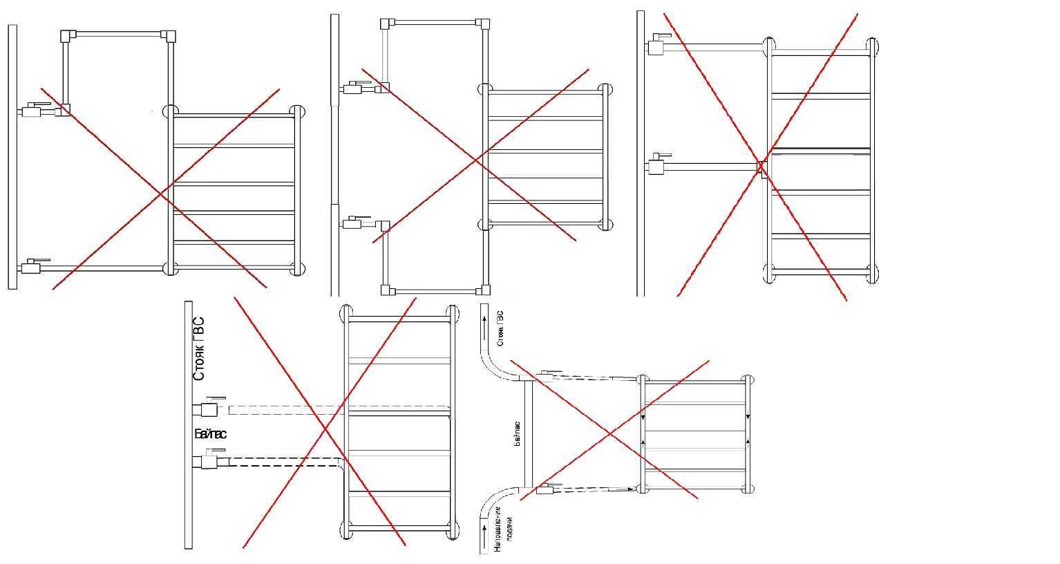 Ниже приведены варианты неправильного подключения, при которых полотенцесушитель греется плохо или совсем не работает.