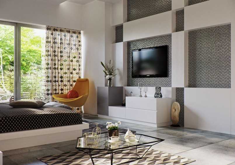 Геометрический рисунок, напротив, можно выбрать в комнату в стиле модерн. К ярким занавескам нужны нейтральные обои, а к рельефным обоям – сдержанной расцветки.