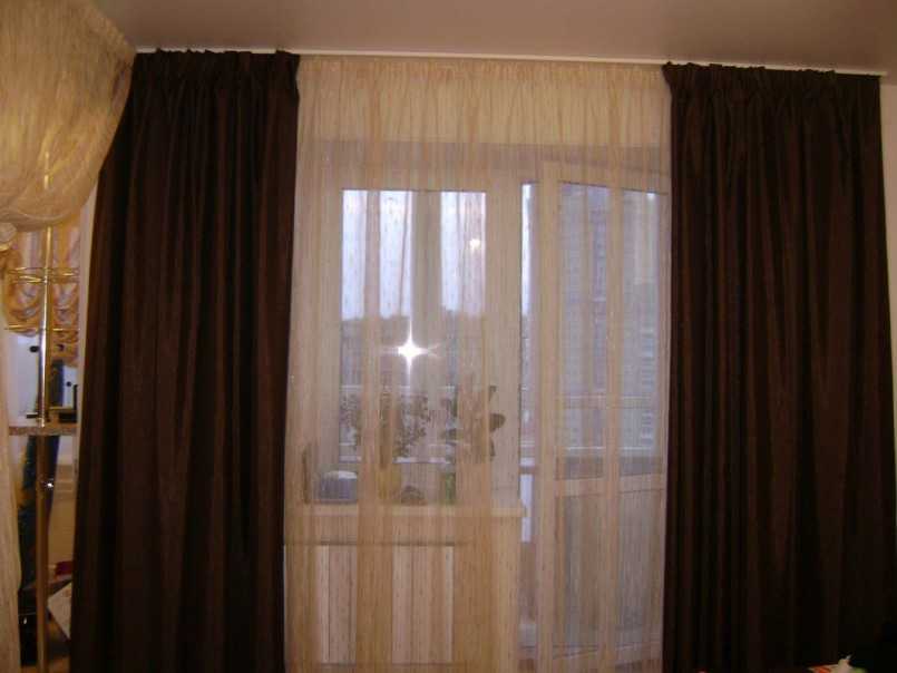 Если в комнате есть выход на балкон, то наиболее подходящим вариантом оформления оконного проема и балконной двери станут шторы из тюля асимметричного кроя.
