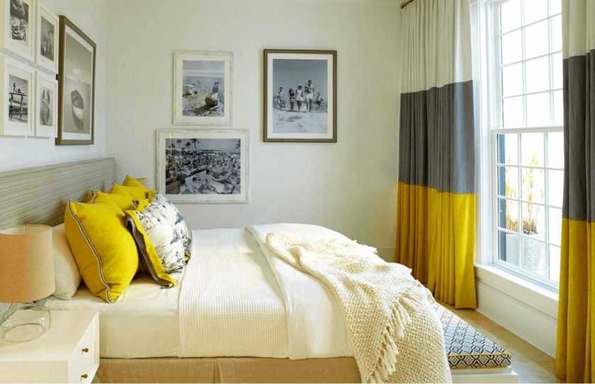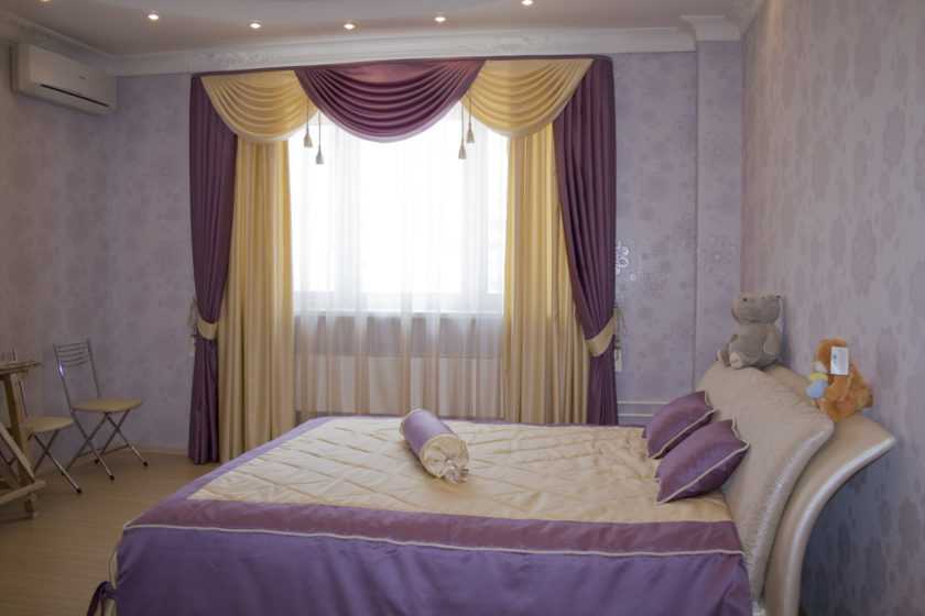 Если спальня скромных размеров, то лучше остановить выбор на коротких занавесках до подоконника и дополнить модель рулонными или римскими шторами.