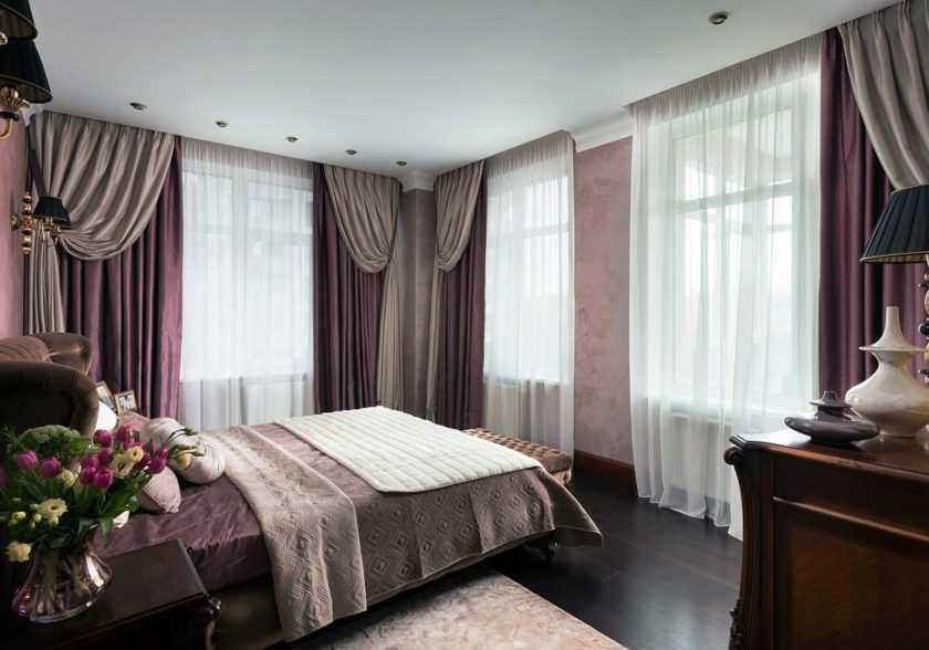 Шторы на два окна можно сделать однотонными либо подобрать комбинацию из нескольких оттенков.