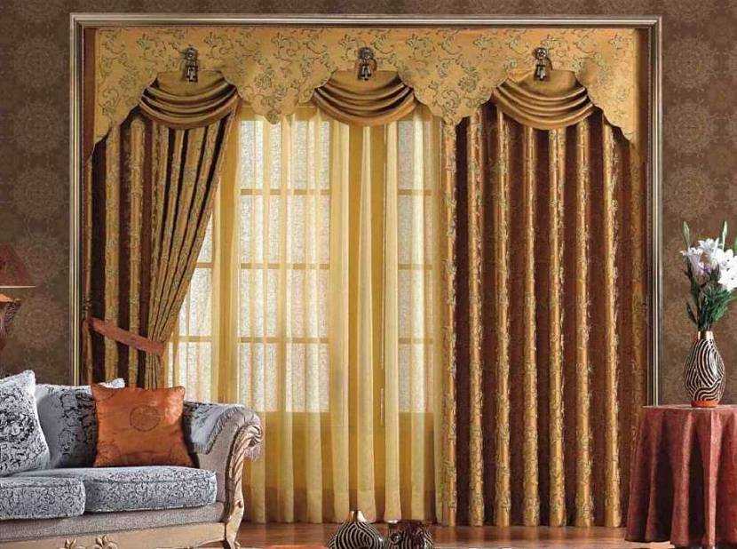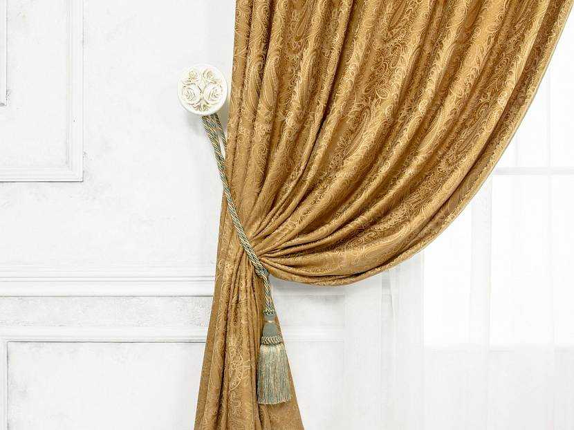 В зал они вносят роскошь. Лучше, если будет в одном тоне с портьерой, но, не повторяя ее. Например, прекрасно сочетается базовый коричневый и сваги бежевого тона.