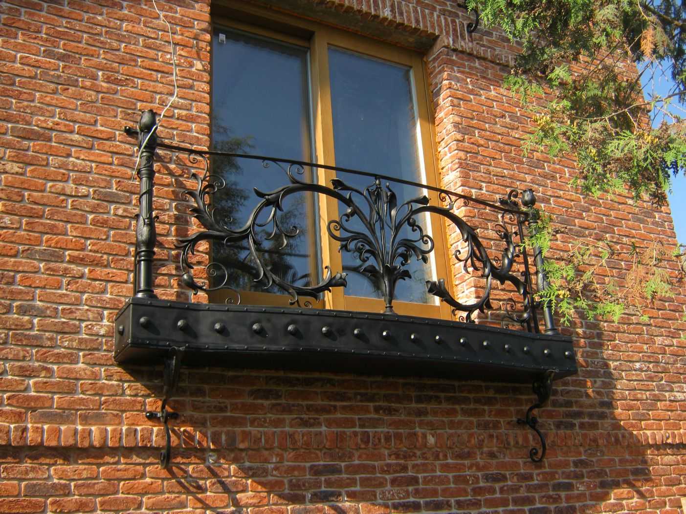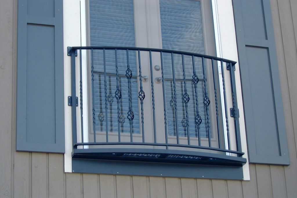 Классический вариант – это оконный или дверной проём с декоративными парапетом из металла. Зачастую несущая плита не превышает длины стопы, но иногда доходит максимум до полуметра. Такая конструкция не предполагает продолжительный отдых на свежем воздухе.