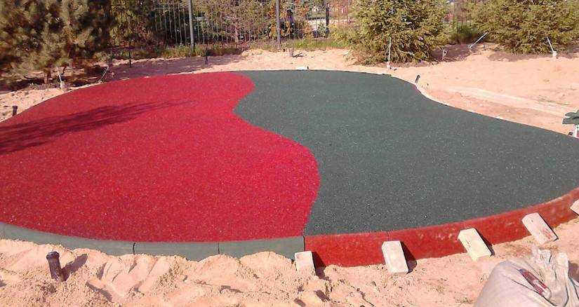 Подобрав нужное процентное соотношение компонентов, следует производить все замесы, используя данную рецептуру, так как только в этом случае удастся добиться однородного по плотности и окраске резинового покрытия на всей поверхности площадки.