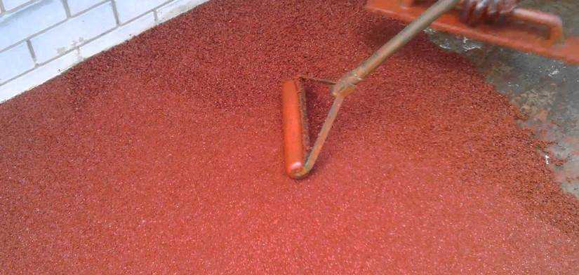 В качестве такого средства можно использовать мыльную воду, уайт-спирит или скипидар. После заглаживания, поверхность смеси требуется прикатать, используя валик для укладки резиновой крошки. В результате этой операции покрытие уплотняется и образуется гладкая текстура.