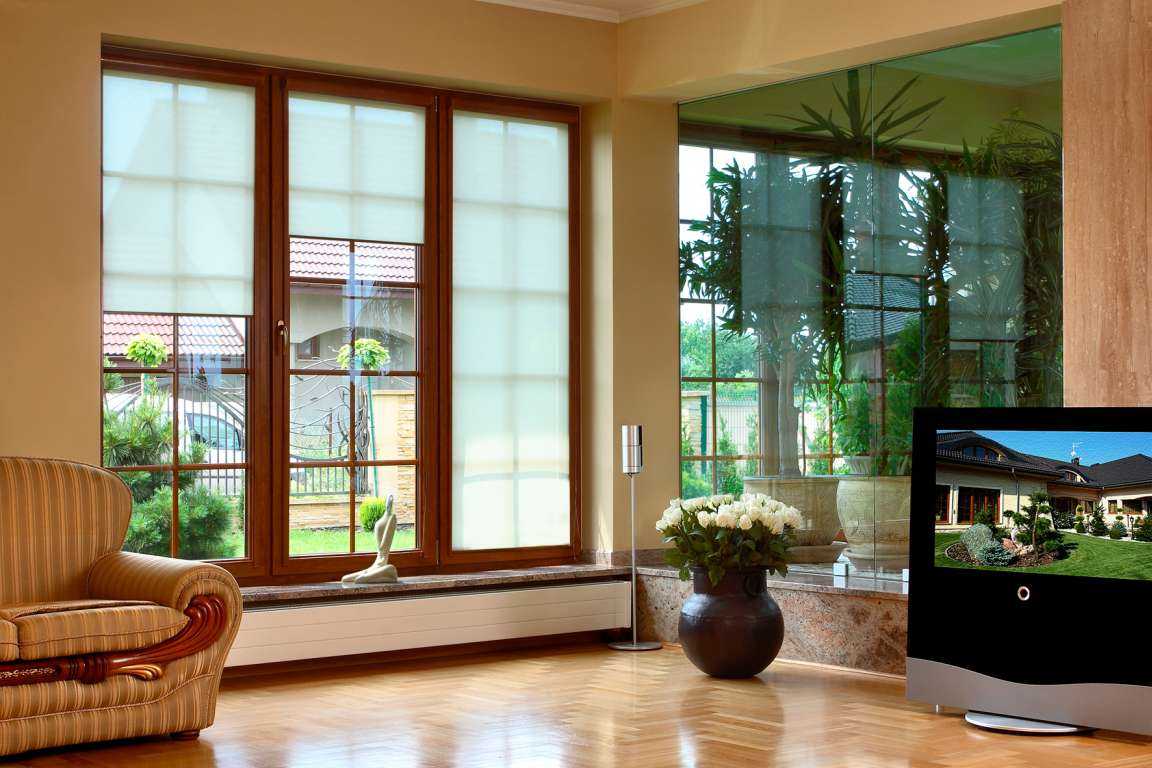 - усиленное стекло – если остекление начинается ниже 0.45 м от пола. Если виды из окна не радуют, посадка подоконной доски в гостиной находится на отметке 0.8 м – немного выше обеденного стола.