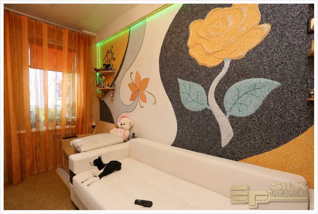 Очень эффектно смотрится панно, нанесенное на стену, которое сделано при помощи жидких обоев Silk Plaster. Шелковая штукатурка способна придать оригинальный вид любому помещению, будь то гостиная, кухня или спальня. В этих комнатах жидкие обои Силк пласт могут иметь более строгий рисунок, а прекрасным украшением детской станут панно с изображениями животных или мультипликационных героев. Аппликация может создаваться частично, например, как на фото, поверх обычной штукатурки, или в виде принта различных цветов, который закрывает всю стену полностью.