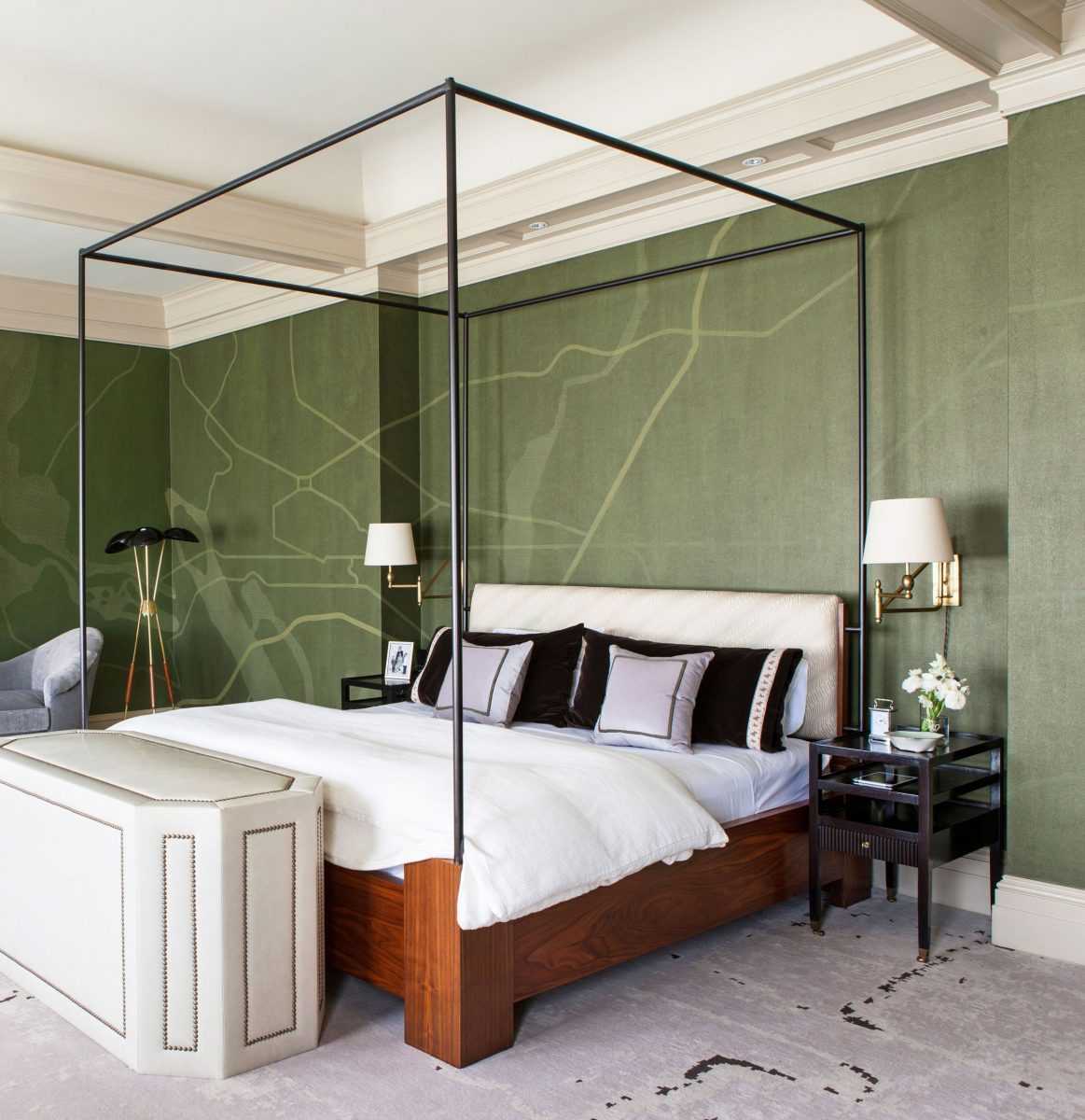Стандартный и самый лучший вариант классических обоев для спальни, это обои с цветным фоном и узором без сильного контраста. Это может быть либо узор, отличающийся от основного цвета на 1-2 тона, либо серебряный или золотой узор.