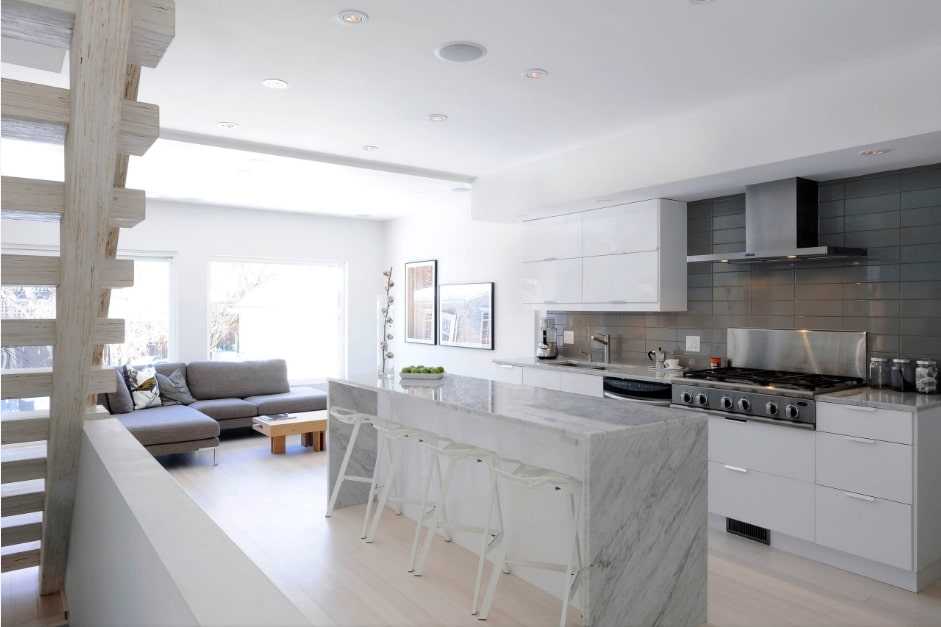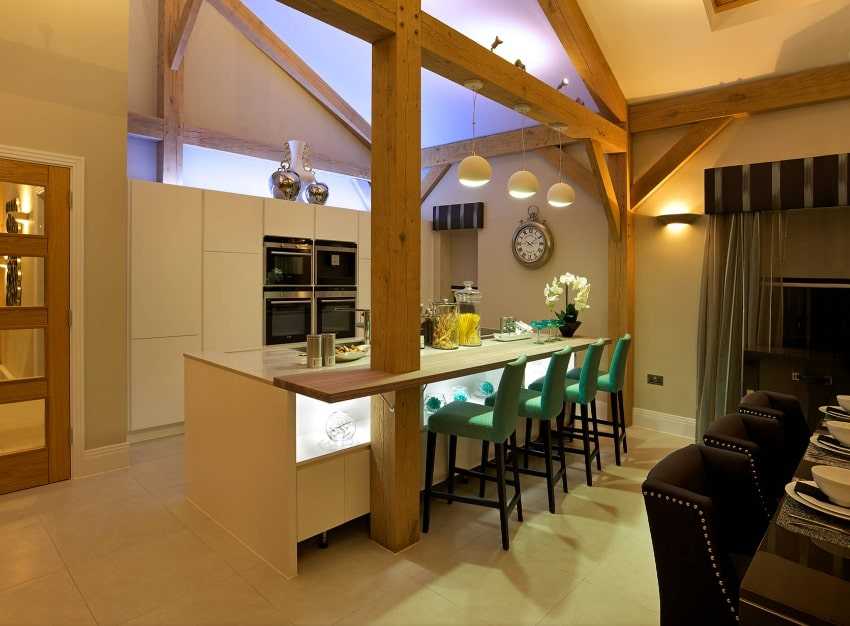 В квартирах, где кухня и гостиная объединены, такая стойка может стать незаменимым элементам обустройства и зонирования. Обычно более низкую сторону устанавливают со стороны кухни, а высокую — со стороны гостиной.