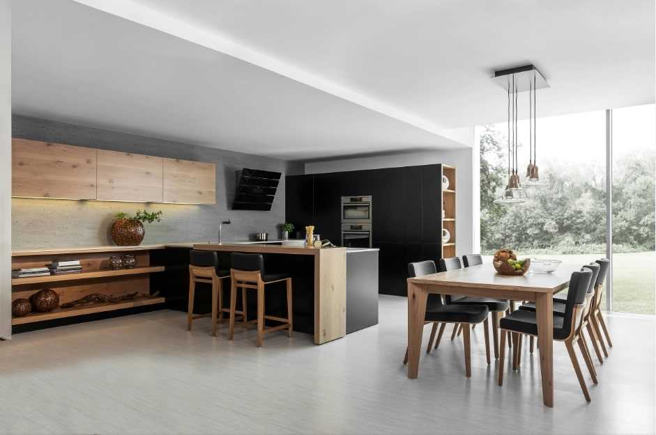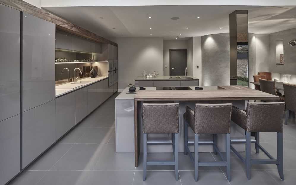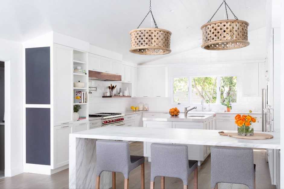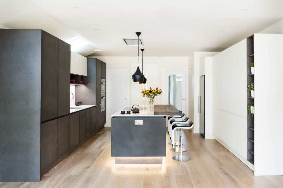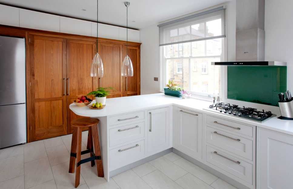 Хорошо, если стойка устанавливается под углом к основной рабочей зоне. В длинной вытянутой кухне это поможет сбалансировать форму помещении, приблизив ее к желаемому квадрату.