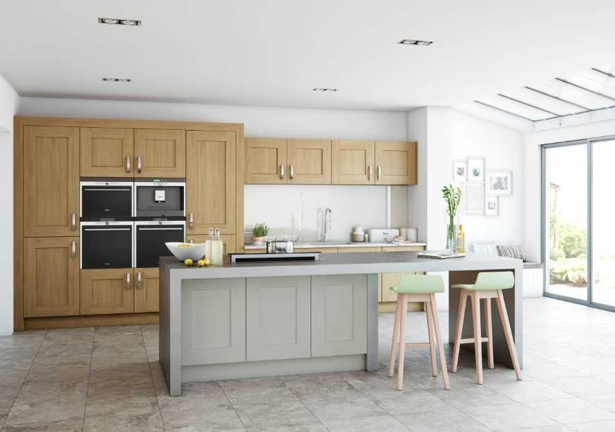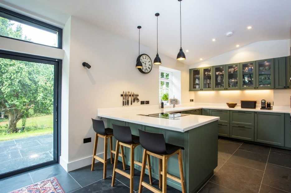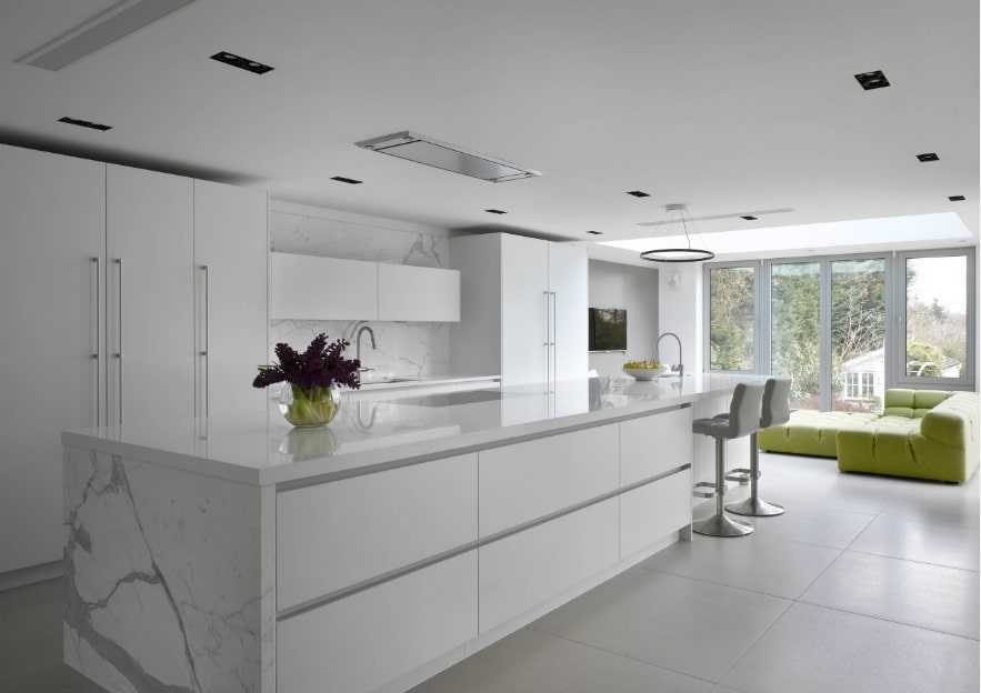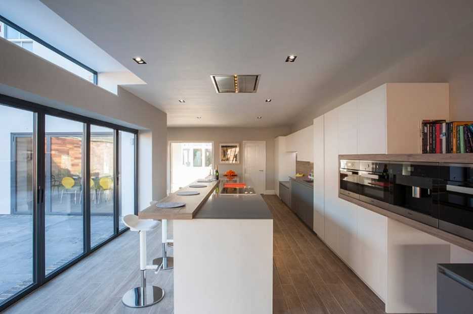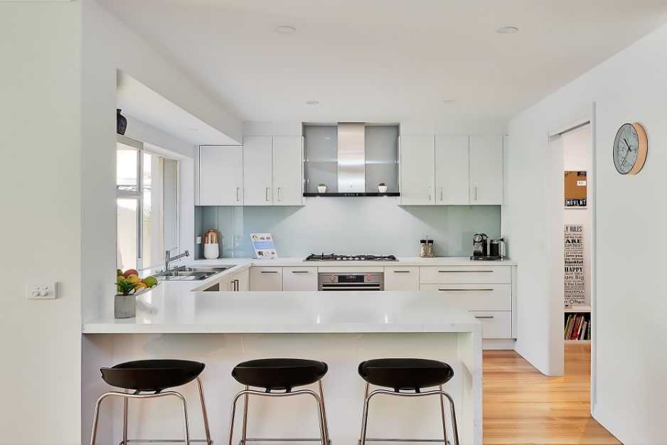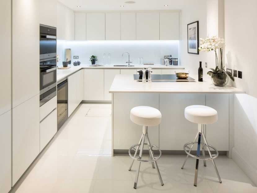 Хорошо, если стойка устанавливается под углом к основной рабочей зоне. В длинной вытянутой кухне это поможет сбалансировать форму помещении, приблизив ее к желаемому квадрату.