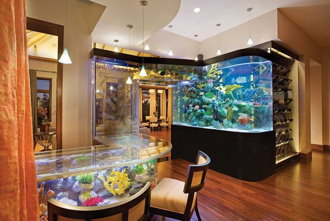 Очень интересно смотрятся аквариумы внутри барной стойки. Не уверены, что сможете ухаживать за рыбками? Существуют вполне достойные имитации, например, искусственные рыбки, очень похожие на настоящих. Или же вы можете установить внутри стерео-панель — правда, по стоимости такое решение сравниться с монтажом того же аквариума.