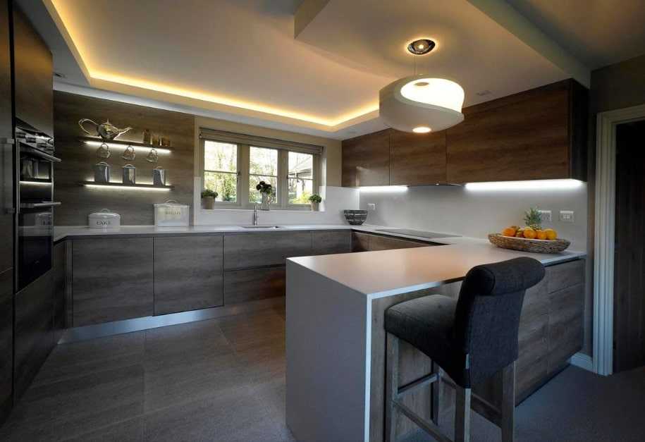 Для кухонь в современном стиле вы можете использовать светодиодную ленту — она придаст интерьеру некий налет фантастичности и красиво подсветит барную стойку.