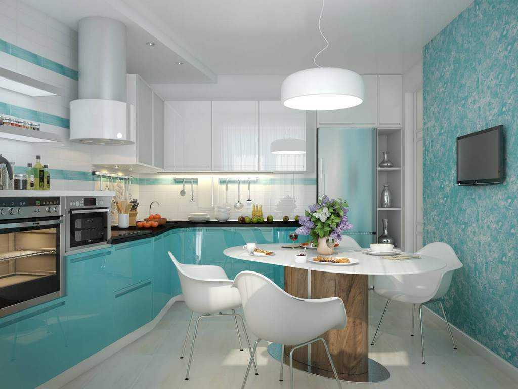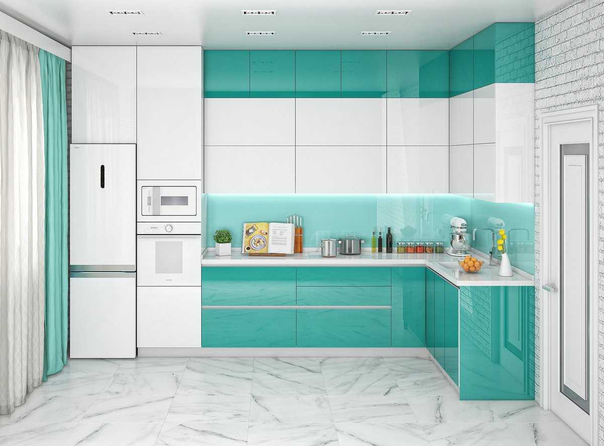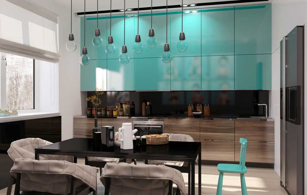 В таком интерьере основная отделка нейтральная (белая, серая, бежевая). Но глянцевый бирюзовый кухонный гарнитур или потолок будет смотреться выигрышно. Дополнениями послужат хромированные вставки на бытовой технике и фасадах.