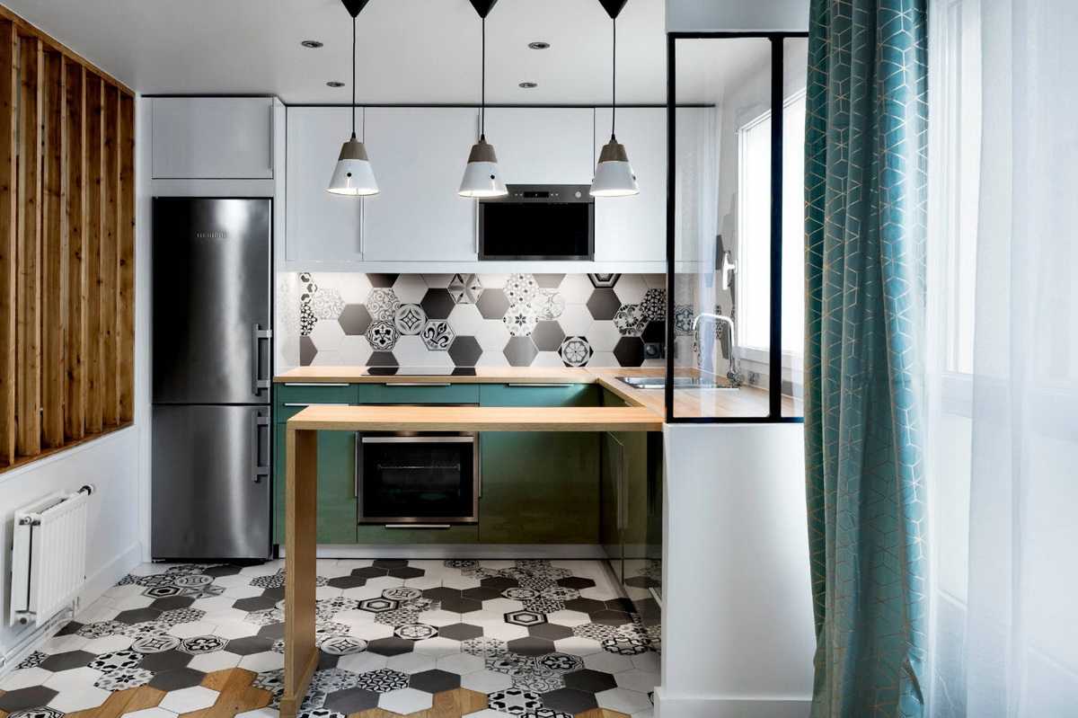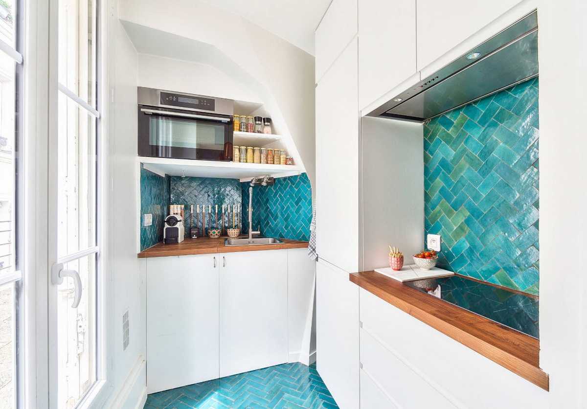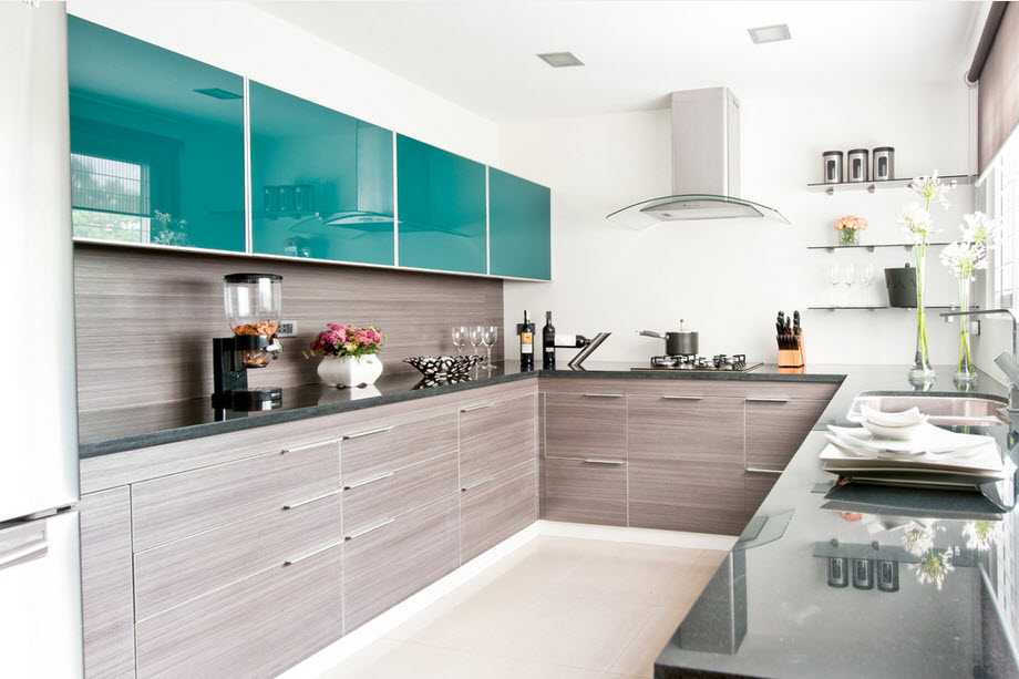 Рабочая зона с бирюзовым фартуком становится изюминкой интерьера кухни, создает впечатление стерильности. Изготавливают его из керамической плитки, скинали или пластиковых панелей. Отлично смотрится с фасадами белого, черного или серого цвета. Темные оттенки можно комбинировать с деревянным кухонным гарнитуром или светло-бежевым.