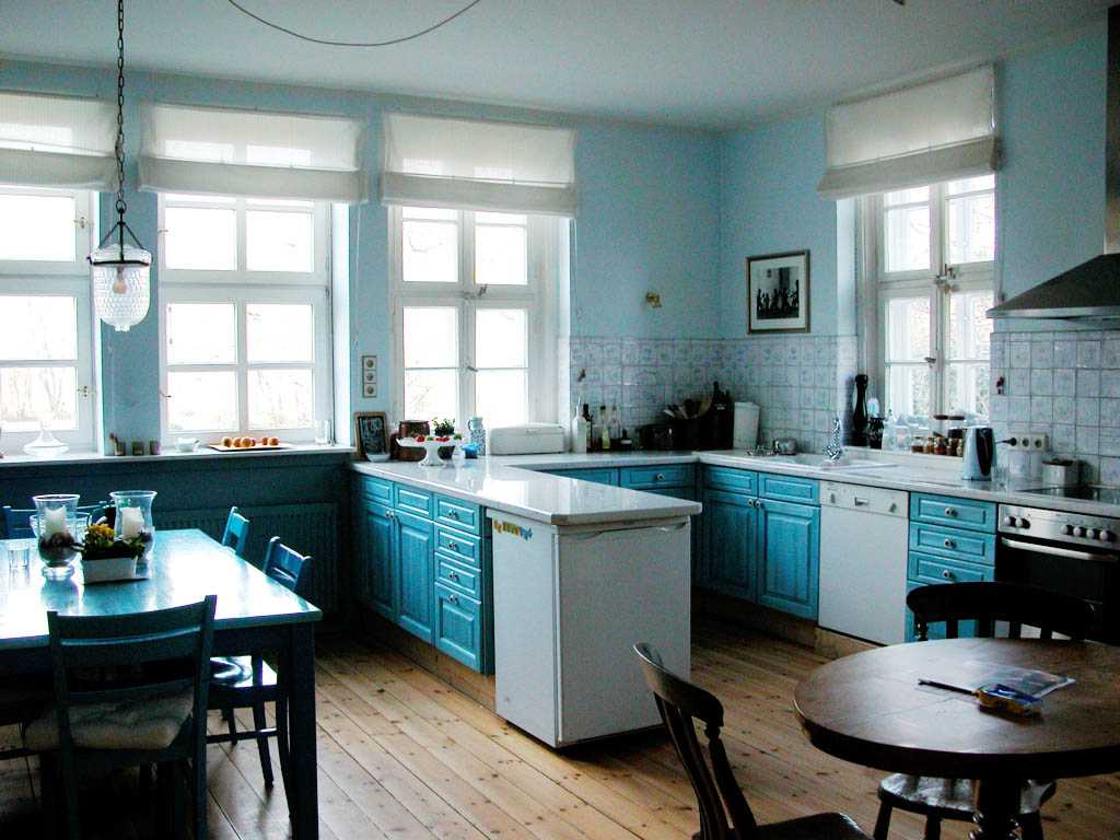 Для кухни в стиле прованс подходит самый светлый оттенок бирюзы с преобладанием голубого.