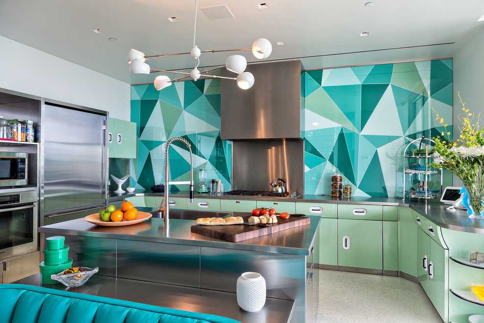 В этом стиле основной упор делается не на цвет, а на геометрию и утилитарность. Бирюзу можно применять как для отделки стен, пола, потолка, так и оформления кухонного гарнитура либо в качестве акцента. Главное – подобрать мебель строгих простых форм, мультифункциональную технику и использовать минимум декора.