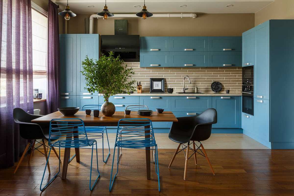 Для оформления просторного помещения можно воспользоваться всем цветовым спектром, подбирая разные варианты с учетом личных предпочтений. Даже при визуальном разделении пространства на место для приготовления пищи, столовую и диванную зоны необходимо соблюдать цветовую гармонию во всем помещении. Например, темно-голубой оттенок рабочей поверхности должен присутствовать в виде нежного декора на диванных подушках и такого же тона табуретов вдоль барной стойки.