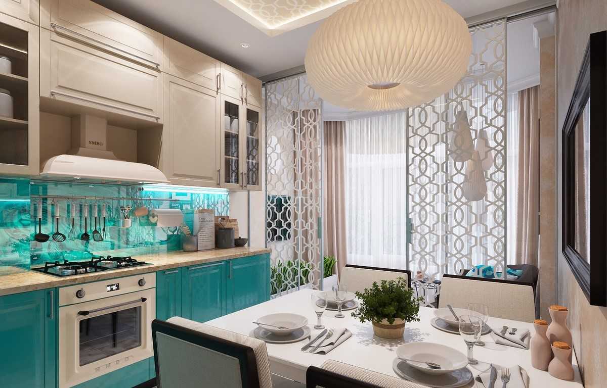 Бирюзовые шторы и другой кухонный текстиль помогают стилизовать кухню, придают ей свежесть морского бриза и визуальную легкость. Интересно смотрится хрустальная посуда, картины или рисунки на стенах с использованием оттенков бирюзы. Интересно и необычно смотрятся плафоны на люстре или светильники в сине-зеленых тонах, создают необыкновенную, сказочную атмосферу.