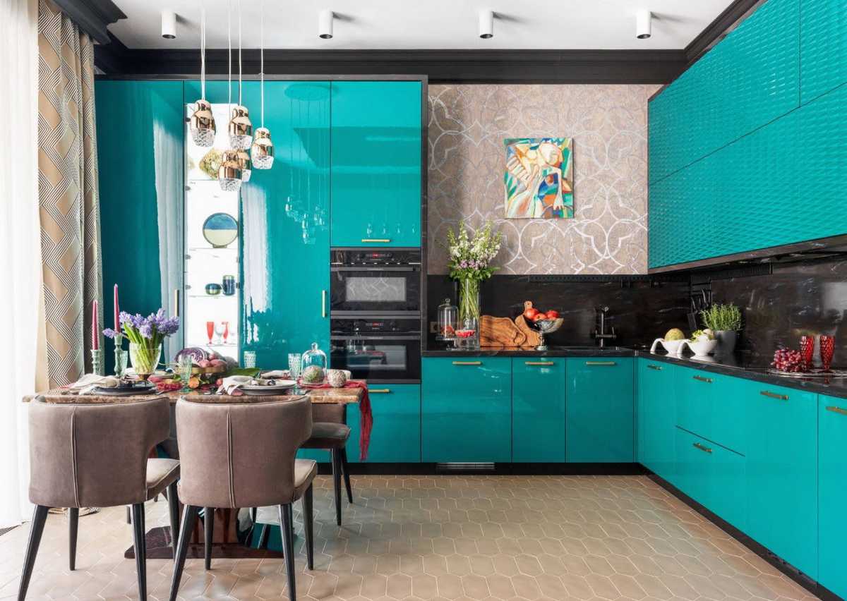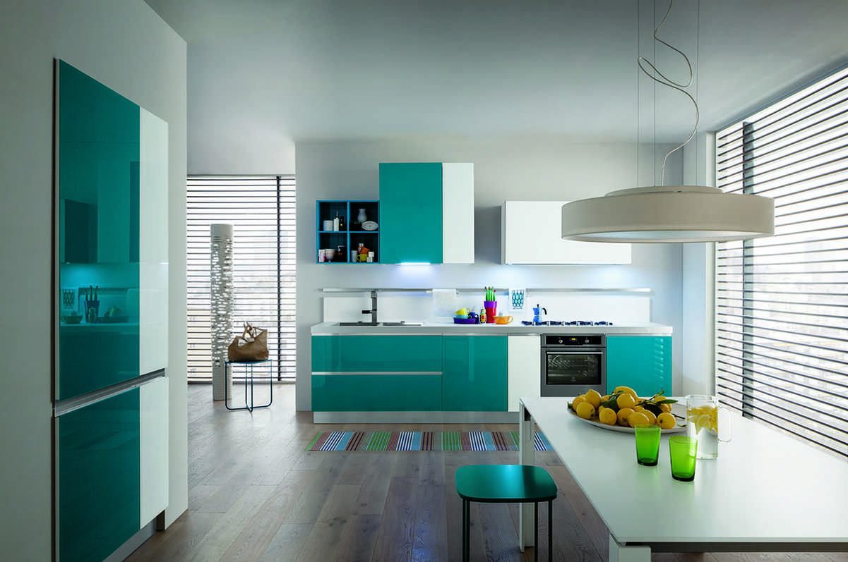 Однотонный бирюзовый кухонный гарнитур однозначно становится центром внимания. Оттенок выбирают в соответствии с освещенностью пространства.