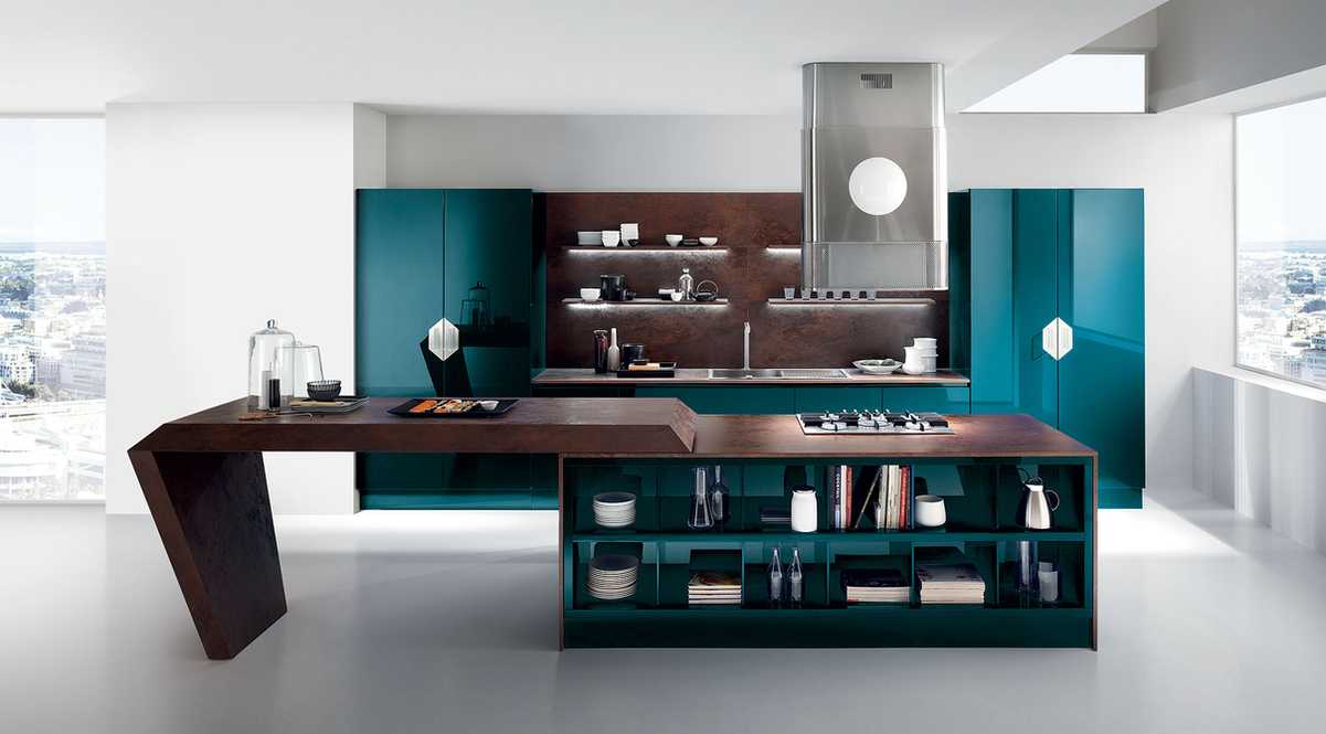 Кухни в современном стиле сочетают в себе домашнее тепло и продуманную холодную практичность. Такой баланс на тонкой грани свойственен и бирюзовому цвету, поэтому они отлично дополняют друг друга. А простые формы с четкой геометрией позволяют вдоволь экспериментировать с фактурами и цветовыми сочетаниями.