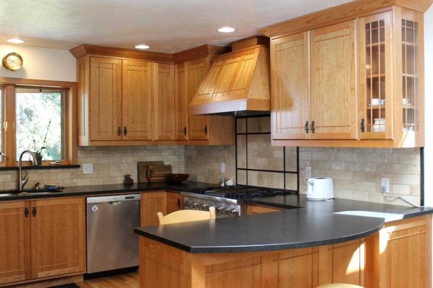 К примеру, Вы уже выбрали черную столешницу и оранжевый гарнитур. Какой в данном варианте должна быть стеновая отделка, потолка и пола? Чтобы не получить излишек цвета, лучше выполнить светлую неяркую облицовку. Стены могут быть матового персикового оттенка. Для потолочной поверхности подойдёт белый цвет, а для напольного покрытия – мраморный черный.