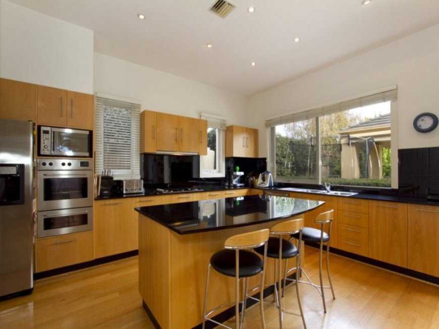 Преобладание черного уместно в просторной, освещенной кухне. Традиционная кухня с доминантой черного комплектуется обычно темными напольными тумбами и шафчиками, а верх при этом оформляется в светлых тонах.
