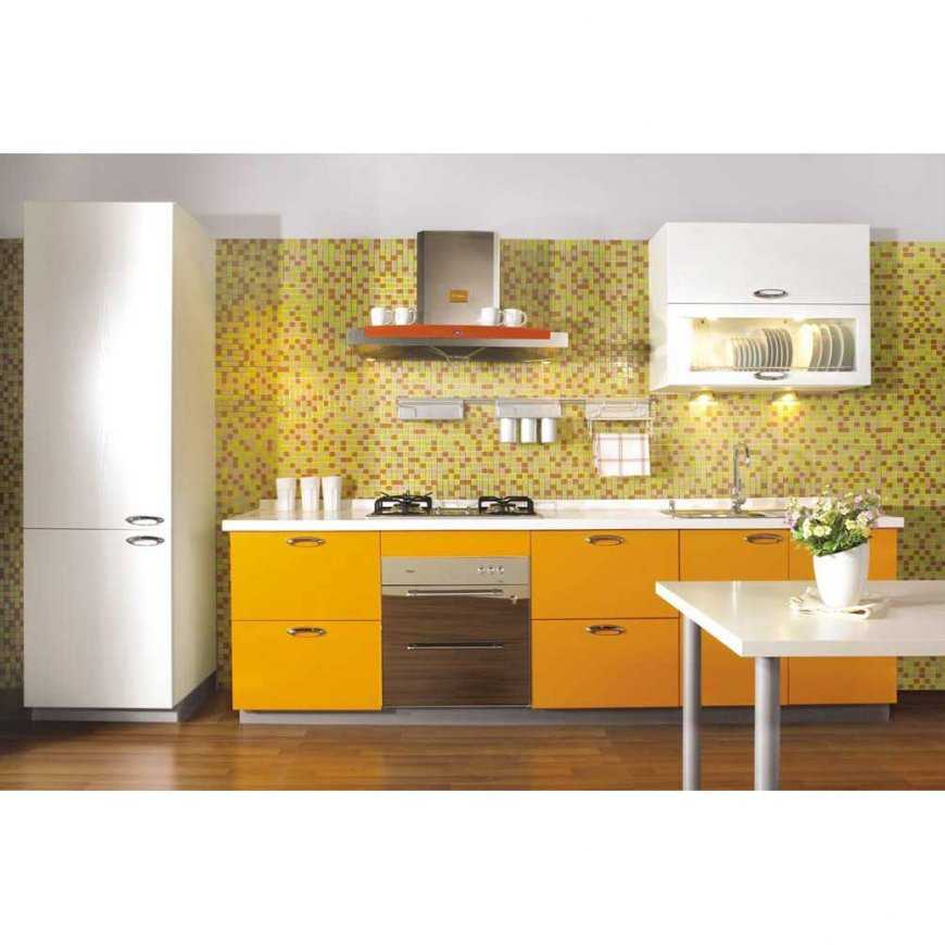 В таком варианте находящиеся снизу напольные шкафы гарнитура имеют оранжевые фасады, а верхние выкрашены в цвет оранж. Цельность комплекта сберегается за счёт одинаковой фурнитуры. Столешница, как пограничный компонент, может быть любого идеально вписывающегося цвета. Она может быть черной, оранжевой, серой или белой.