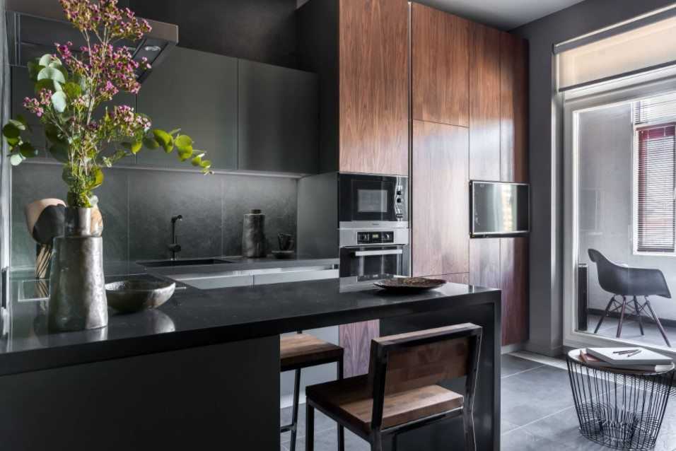 Кстати, темные оттенки особенно хороши на вертикальных поверхностях, например, в фартуке, в оформлении одной акцентной стены или на фасадах гарнитура. Фокус в том, что черный в окружении более светлых оттенков будто утапливается, придавая пространству объем и глубину.