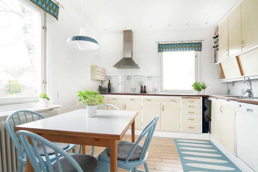 Давно известно, что светлые оттенки помогают визуально «расширить» небольшое пространство, они наполняют его светом, делают предметы более легкими и невесомыми. Если кухня небольшая, светлые тона на ней должны преобладать. Светлыми должны быть стены, потолок и даже пол. Желательно, чтобы вся мебель, в том числе и кухонный гарнитур, тоже были максимально светлыми.