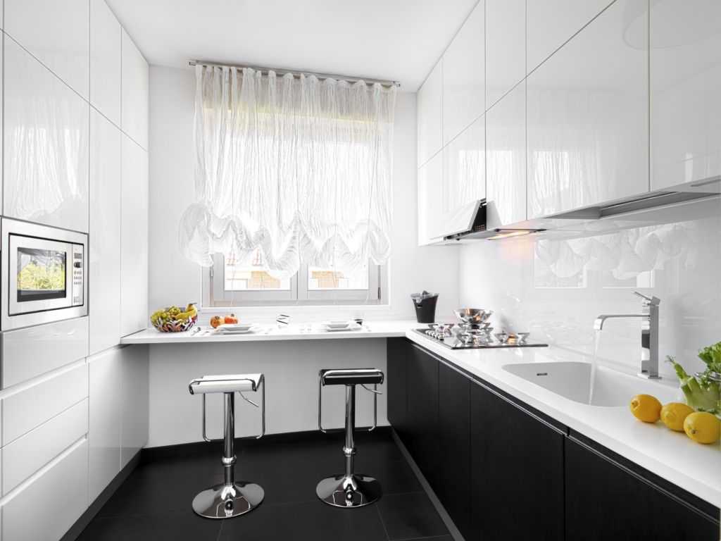 Также можно объединить рабочую зону и столешницу, окно и плиту, тогда появится немного места для обустройства небольшой обеденной зоны.