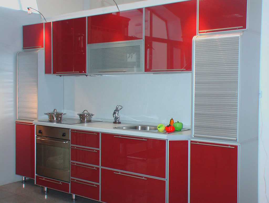 Основой может служить пластик и стекло. Такой материал в алюминиевой рамке выбирают чаще всего для кухонь в стиле техно. Использоваться может тонированное, прозрачное, а также стекло с пескоструйной обработкой, глянцевый пластик или крашеный МДФ. Еще одна особенность такого будет состоять в том, что своими руками можно изготовить все шкафчики – для этого понадобится алюминиевый профиль и подготовленный лист МДФ или ДСП.