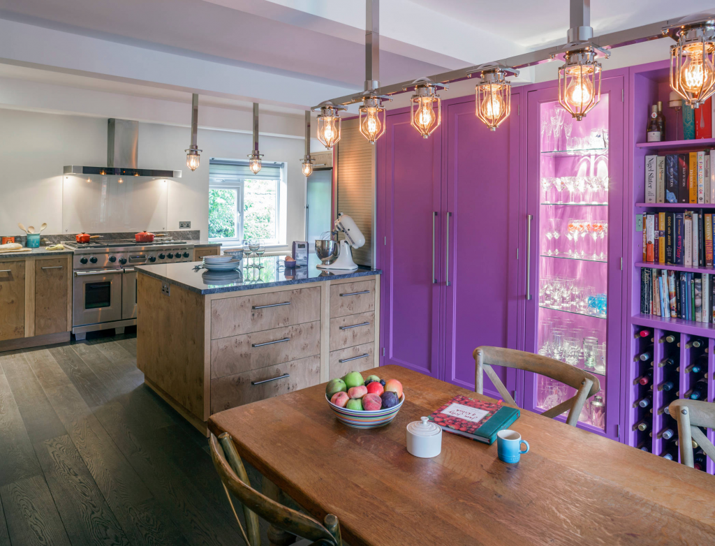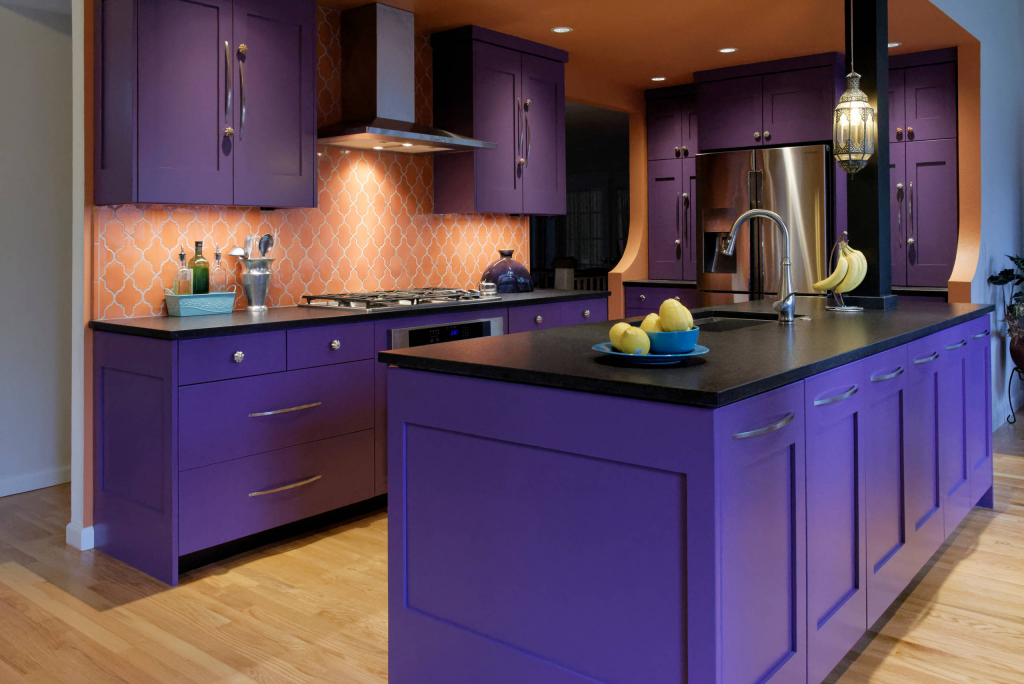 Черничный или фиалковый тон, который сочетается с черными блестящими глянцевыми или матовыми поверхностями, прекрасно дополнит интерьер просторной кухни с качественным освещением.