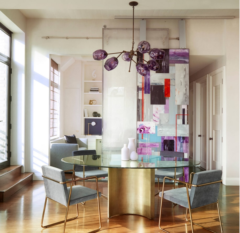 Яркий лиловый с легким винтажным настроением можно использовать в декоре кухни лофт, например, в таких негабаритных, мелких деталях вроде обивки кресел, фартука или постера на стене. В большем количестве можно использовать серо-сиреневый, грязный оттенок, который подчеркнет брутальность лофта.