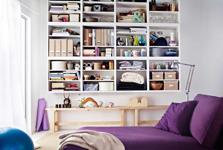 Практично в гостиной установить стеллажи от ИКЕА. Они могут выполнять разную функцию, в зависимости от того, закрытые они или открытые (спрятать или показать расположенные в них вещи). Они бывают:
