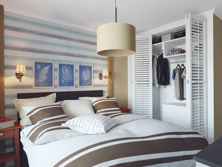 Проекты спален 13 м2 имеют своей главной задачей зрительное увеличение пространства. Для такой комнаты подойдут обои в светлых оттенках. Это может быть розовый, голубой или бежевый цвета, главное чтобы оттенки были приглушенными.
