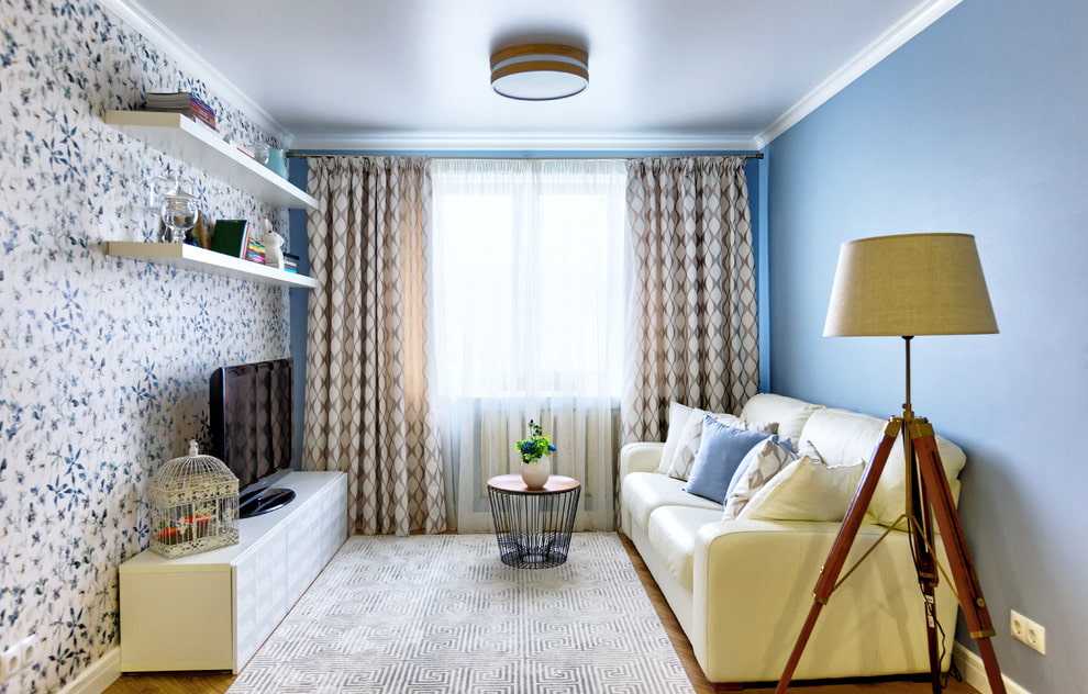 Чем меньше комната, тем больше нужно, чтобы она была светлой. Хорошо окрашивать стены в гостиной в белый цвет или в светлые и прохладные оттенки, например, светло-серый или синий. Прохладные цвета создают впечатление большего пространства, а теплые — наоборот. Поэтому с маленькой гостиной лучше отказаться от цветов, таких как желтый, оранжевый или красный.