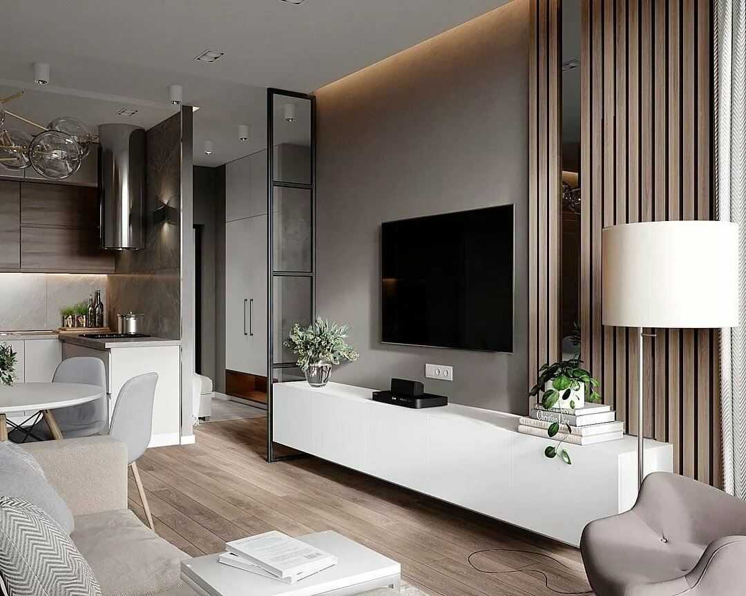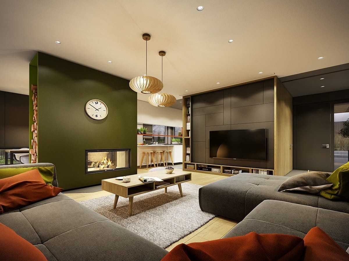 - Функциональность — одна из важнейших составляющих ещё на этапе планирования пространства. Она непосредственно связана с востребованным сегодня зонированием помещений. Современная гостиная часто сочетает зону отдыха, рабочий уголок, кухню-столовую, здесь также может располагаться спальное место.