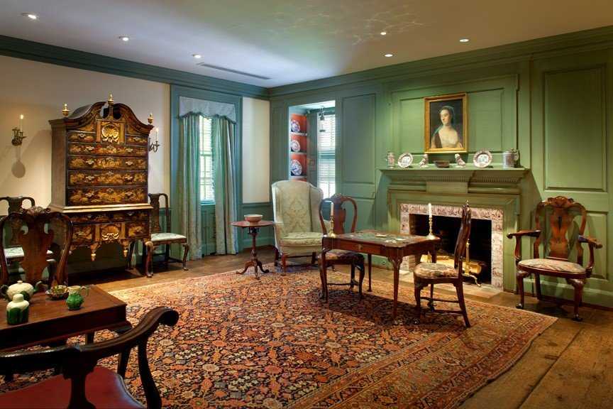 Обязательными элементами интерьера являются тяжелые шторы, выполненные из дорогой материи насыщенных темных цветов, лепной потолок, паркет на полу, золоченые рамы, тяжелая темная мебель с гнутыми ножками и уже упомянутая люстра.