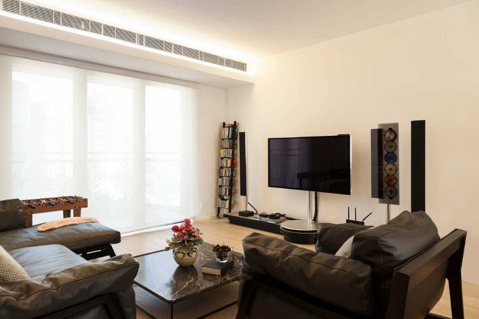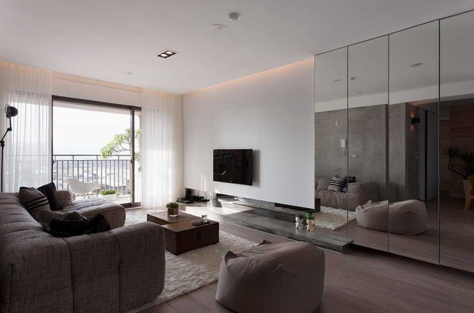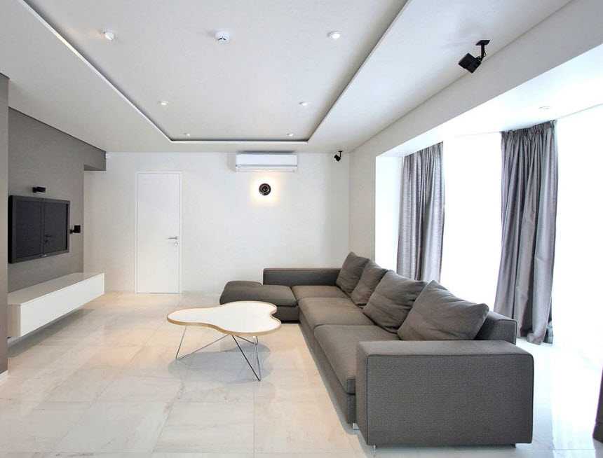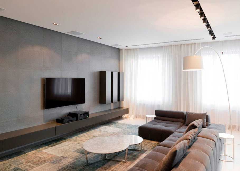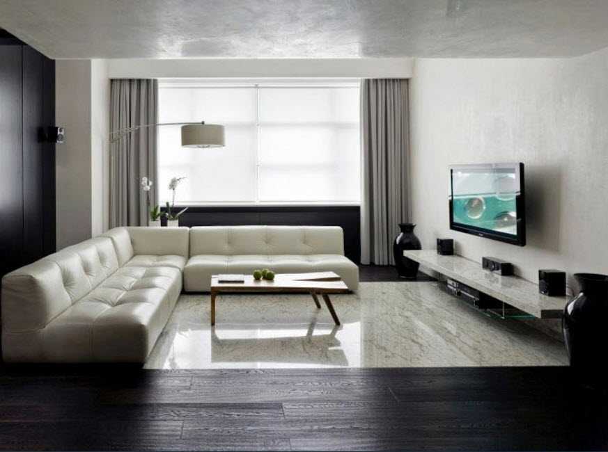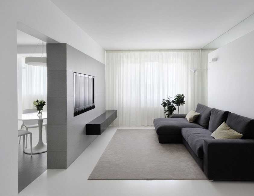 Центральное место отводится мягкой мебели с однотонной обивкой из кожи, льна или хлопка. Основные оттенки: белый, кремовый, серый или черный. Это невысокий диван прямоугольной формы — прямой или угловой, который наиболее часто располагают напротив телевизора.
