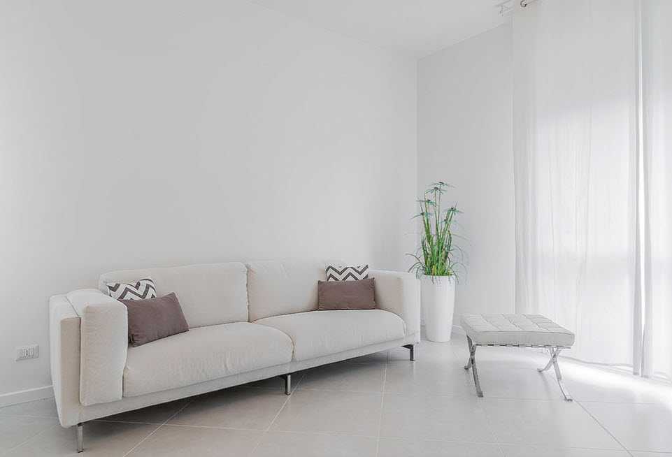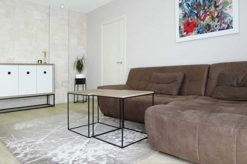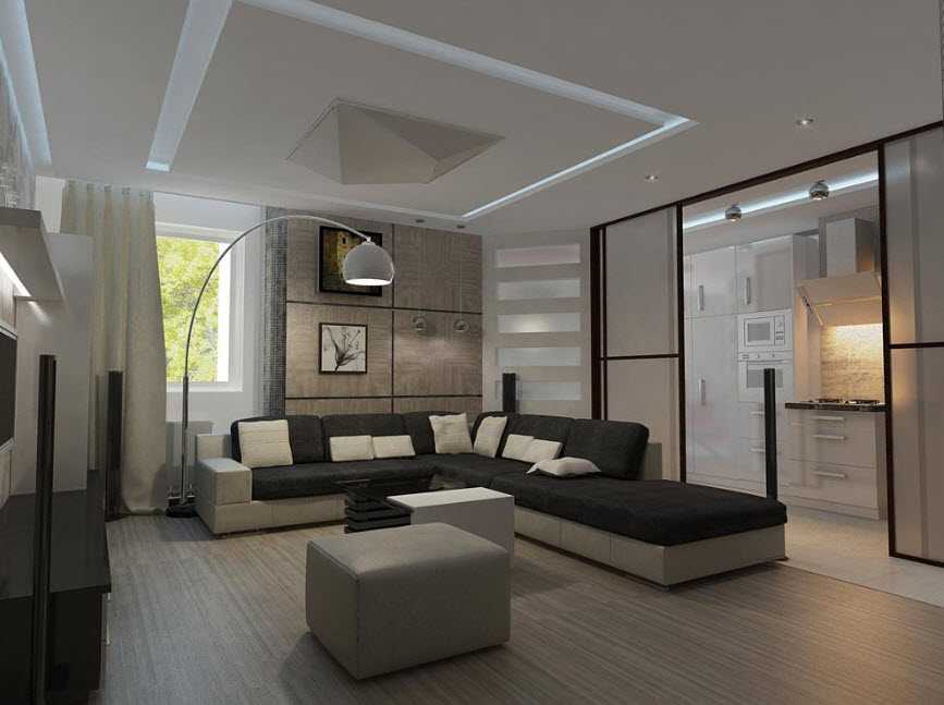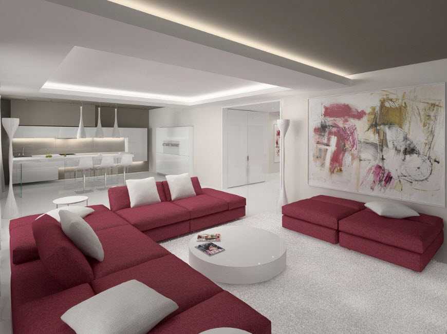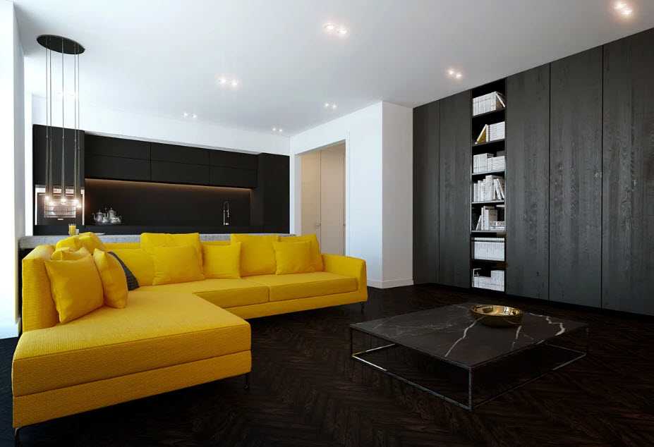 Центральное место отводится мягкой мебели с однотонной обивкой из кожи, льна или хлопка. Основные оттенки: белый, кремовый, серый или черный. Это невысокий диван прямоугольной формы — прямой или угловой, который наиболее часто располагают напротив телевизора.