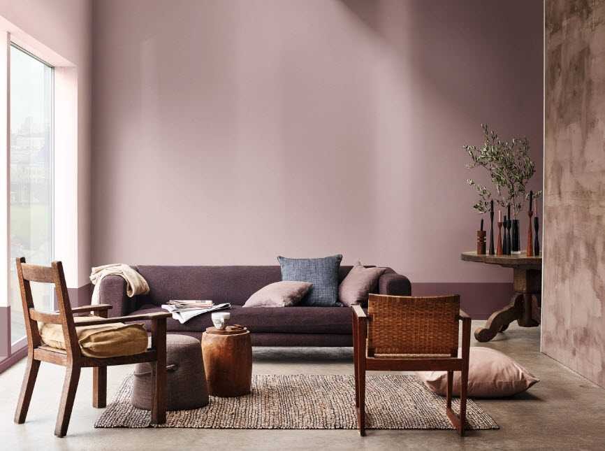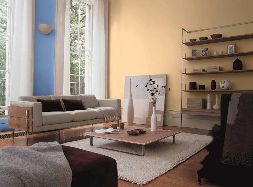 Минимализм не требует сложных решений, поэтому просто выкраси стены гостиной одной моющейся краской. Не бойся белых и светлых цветов – на самом деле они легко моются, а в случае чего – попросту закрашиваются поверх. Можешь совместить несколько похожих оттенков с разницей в пару тонов для акцентов.