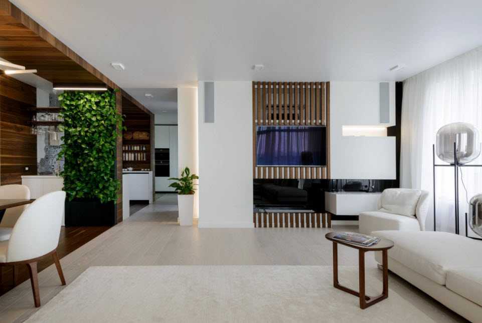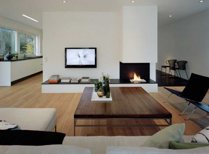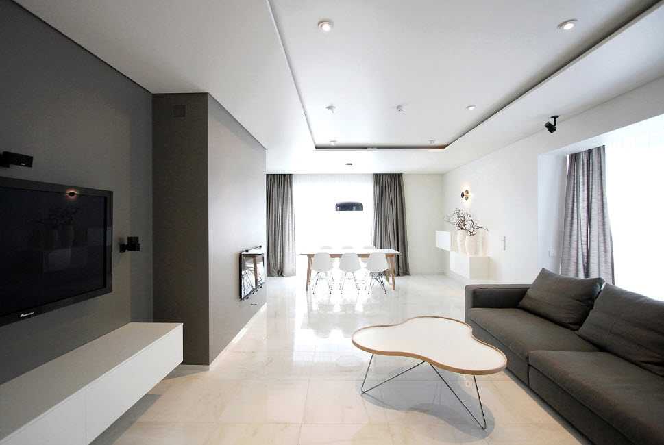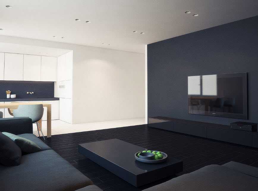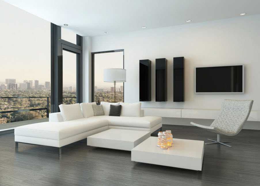 Белый потолок и стены в союзе с тёмными полами — классика гостиной в стиле «минимализм»