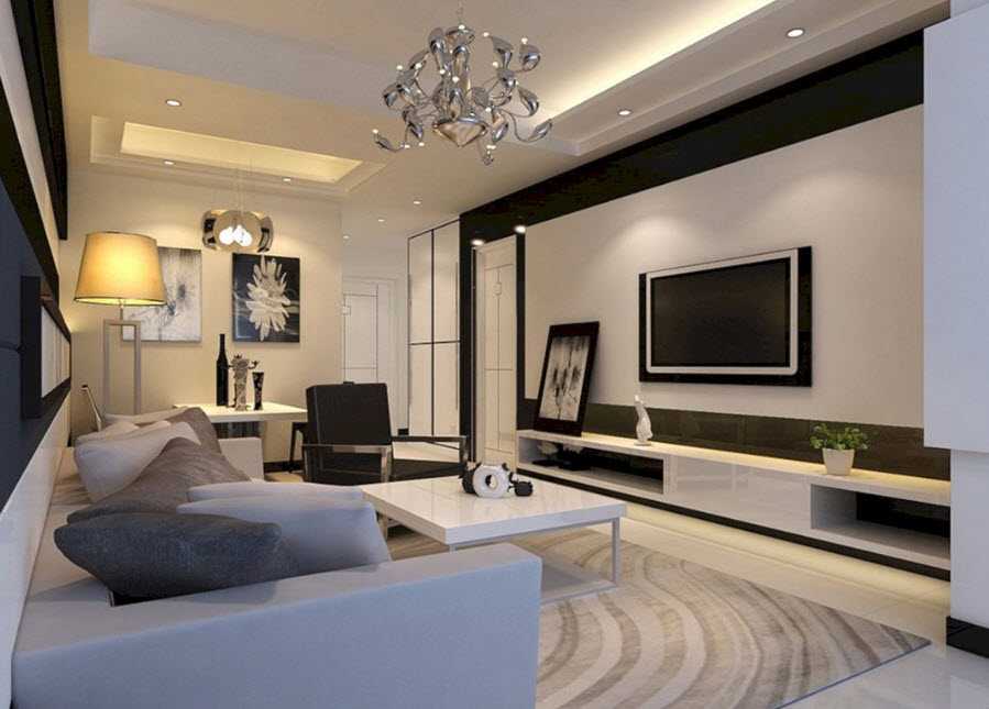 - Натяжной потолок — надёжный, долговечный и красивый вариант, не требующий предварительного выравнивания потолка. Он устанавливается профессионалами. Красиво в интерьере будет смотреться как матовый, так и глянцевый потолок. Для маленьких гостиных отлично подходят глянцевые потолки. Они зрительно делают комнату больше.
