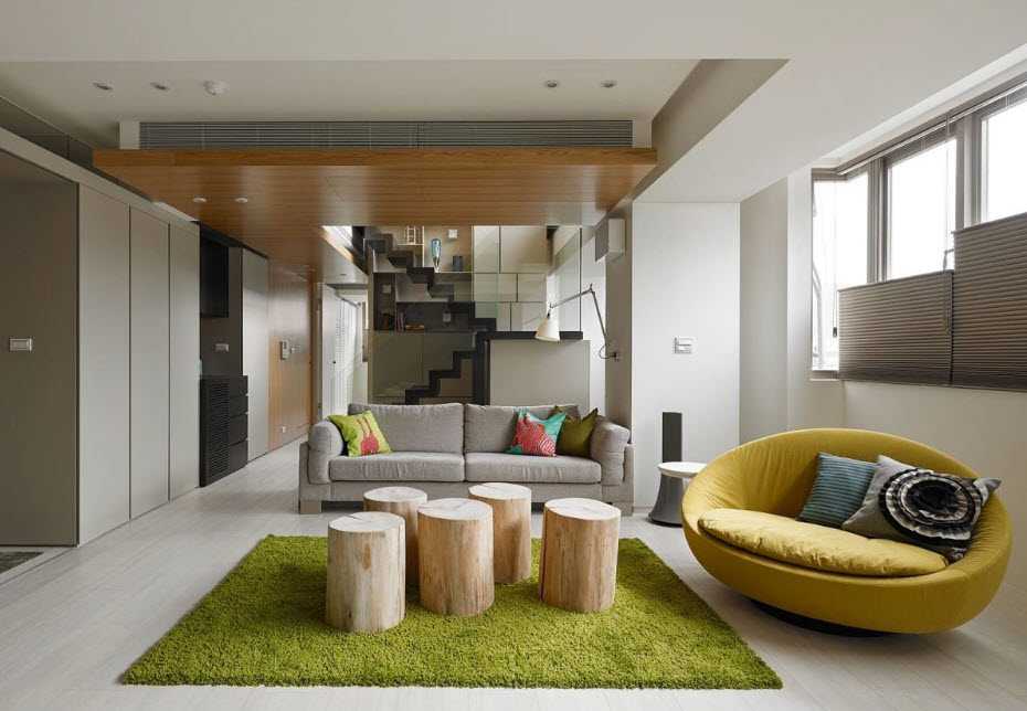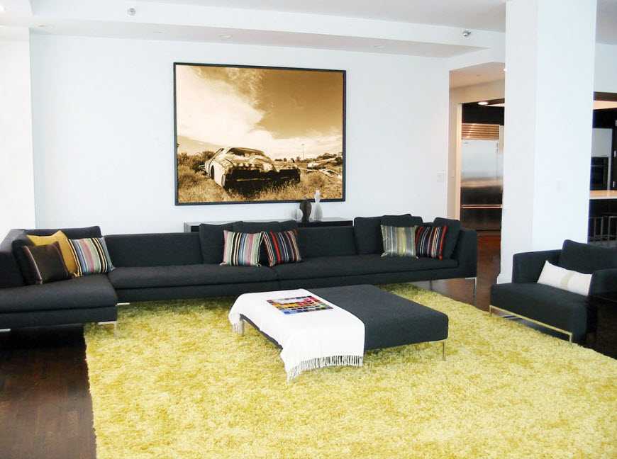 Часто в зоне мягкой мебели стелют небольшой ковер, контрастный цвету пола, но сочетающийся мебелью или отделкой стен.