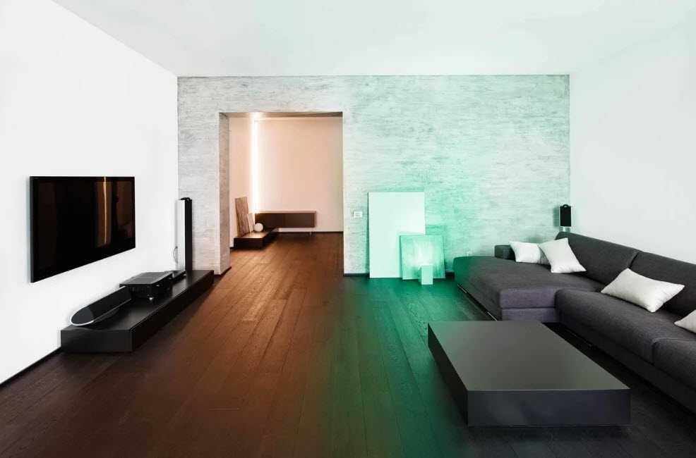 Для минималистичной обстановки гостиной больше всего подходит рассеянное освещение