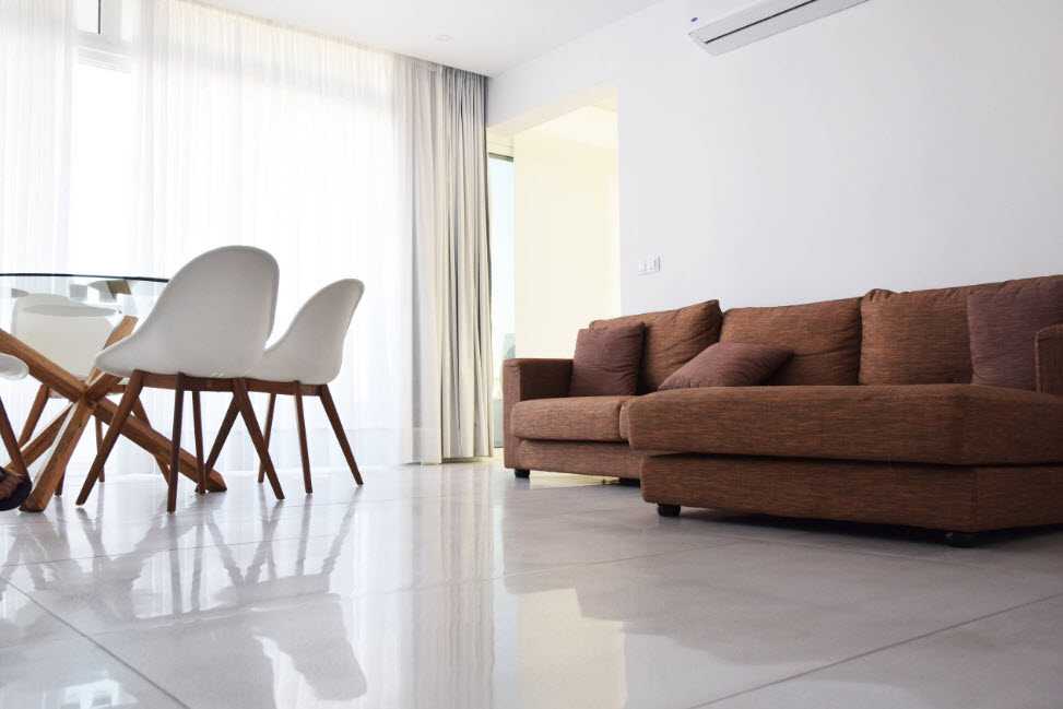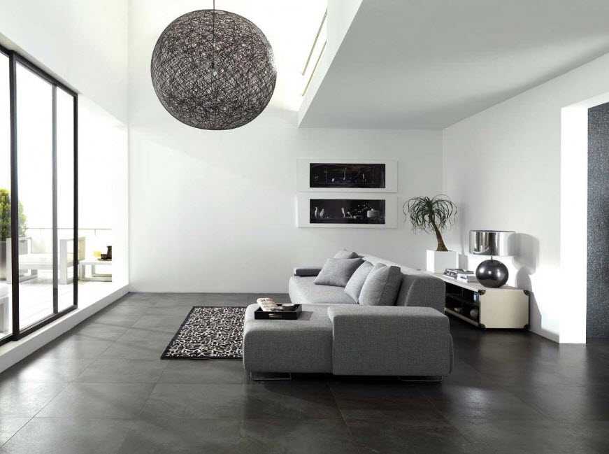 - Керамогранит — практичный и приятный на ощупь натуральный материал. Он не боится воды, агрессивных чистящих средств, может имитировать деревянную и каменную поверхность. На полу гостиной можно установить матовый и шероховатый на ощупь керамогранит или полированный глянцевый.