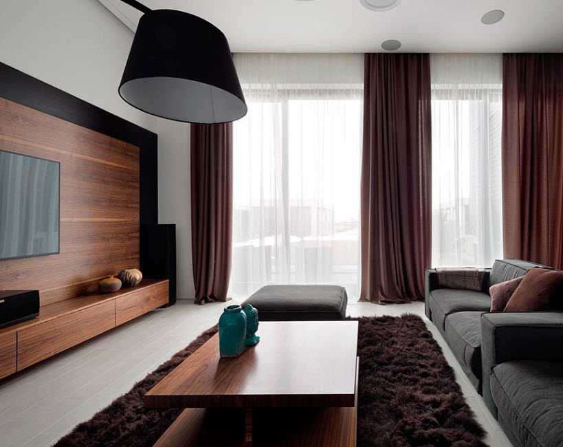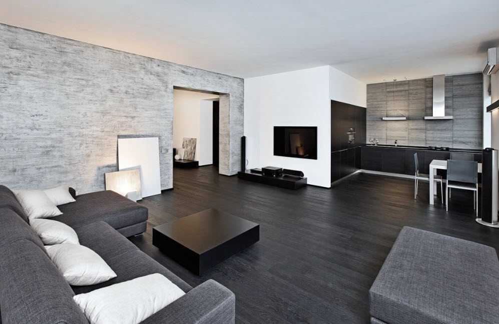 Для отделки стен, пола и потолка в гостиных в стиле минимализм используются натуральные материалы или их качественные имитации.
