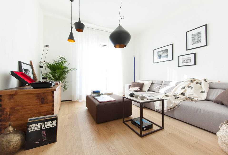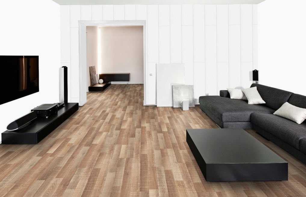 Для пола гостиной лучше всего подходит ламинат – он сравнительно недорогой, практичный и разнообразный. Не используй слишком сложные рисунки – достаточно обычной имитации досок с минимальной обработкой